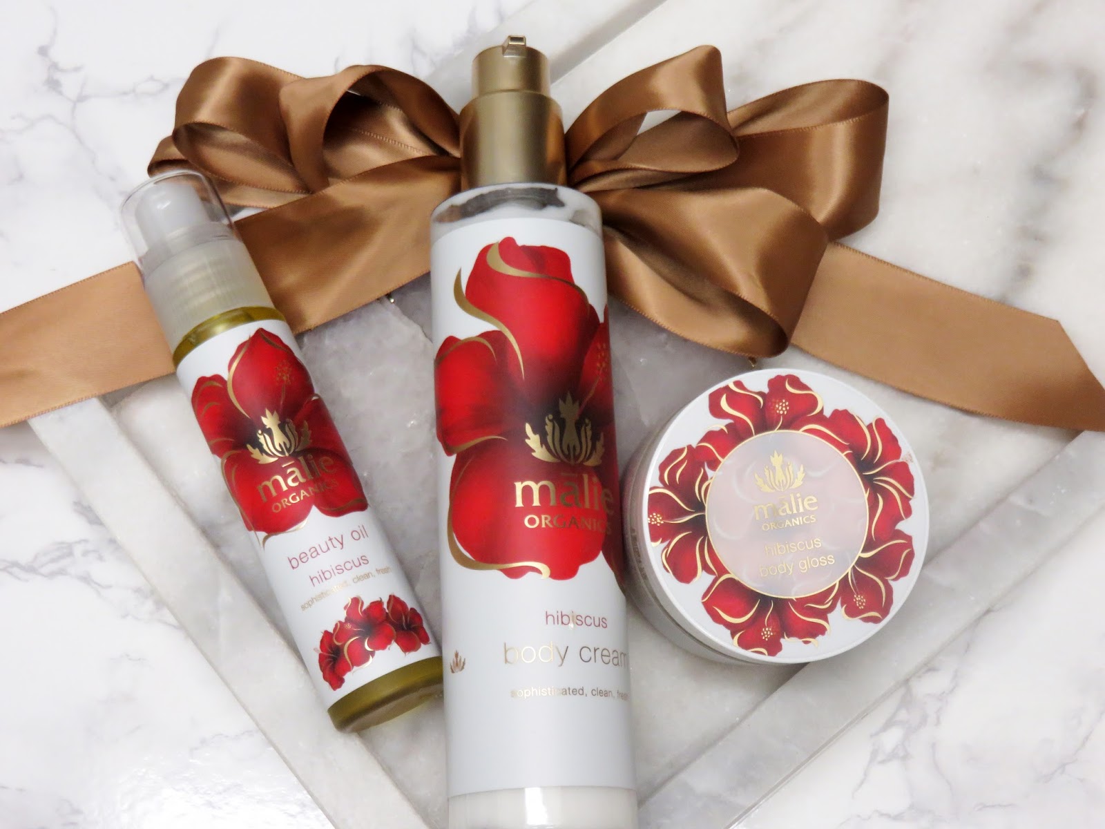 I have been using Malie Organics for months now and I LOVE their luxurious island inspired fragrances! Malie Organics is a Hawaiian luxury spa line that uses all natural and organic ingredients. Through the use of local ingredients and methods they create this truly exceptional line of products. The range is massive and they have the most beautiful scents like Mango Nectar (a personal favorite), Plumeria, and this Hibiscus collection. Malie Organics offers even more scents and a whole range of products from body to hair, and even home products!